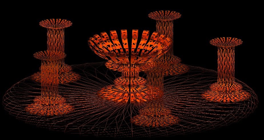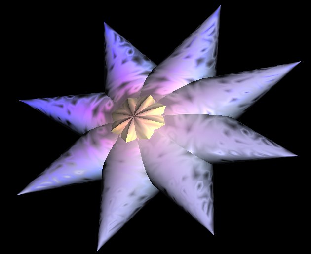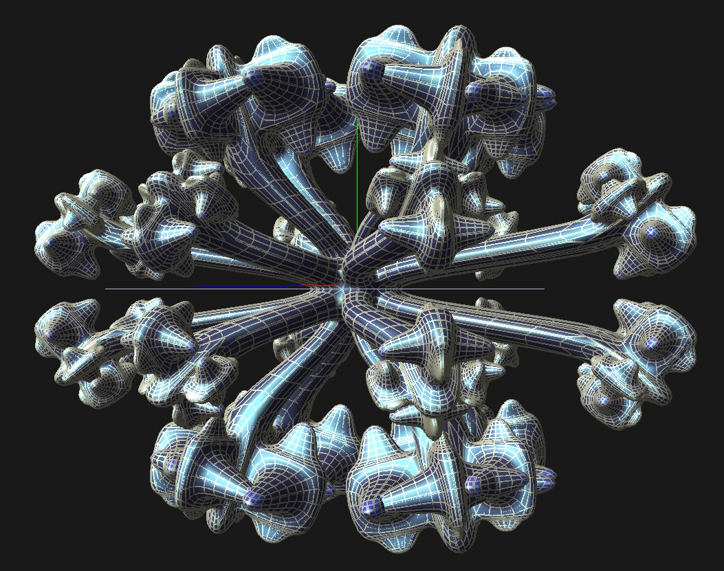 But Lathes are limited.Another technique I looked into was intersections of regular primitives. This can often produce surprising results. The idea is simply to rotate/translate a single primitive. The two screenshots below illustrate some results. The first is a rotated cone, resulting in a star. The second is a very small routine (180 bytes after compression) to generate organic like structures. Again no randomness, just rotate, translate, rotate stuff.