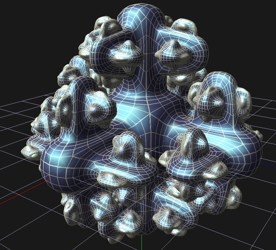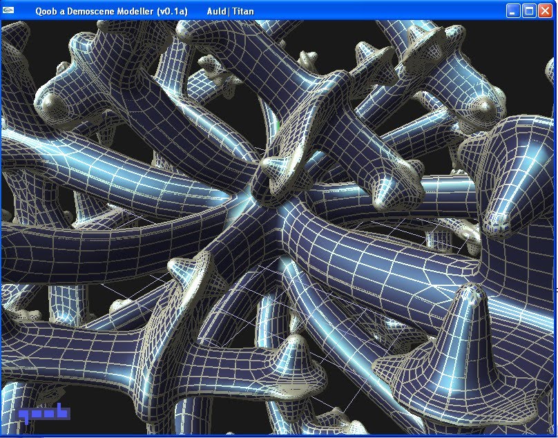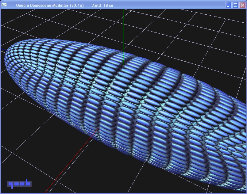 But my goal is always to get away from embarressingly geometrical to something that looks modelled. It occurred to me that crinkler is very successful because it works at compile stage for compression, its not simply an exe packer. Thus my latest project is a modeller, the idea being to use the modelling commands to better compress the end model. qoob is a simple subdivision modeller based on wings3d functionality but very cut down. Its a fresh project but already I can see that no way will this be useful for 4k, only 64k. Thats disappointing but it comes from the fact that the library used to reproduce objects is 2-3k. An early screenshot is not impressive: